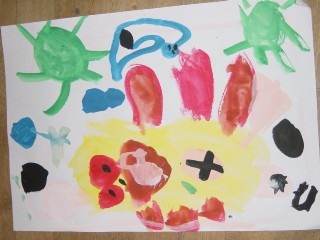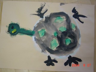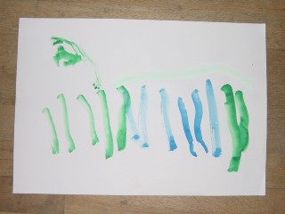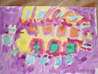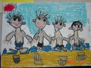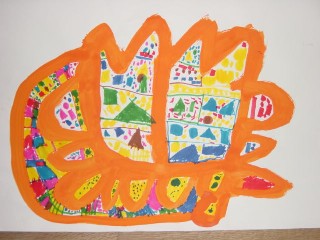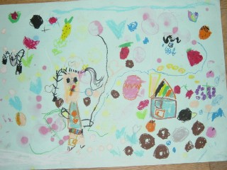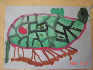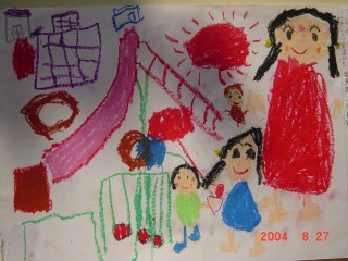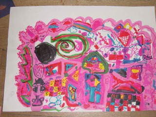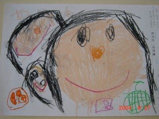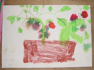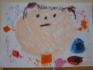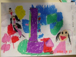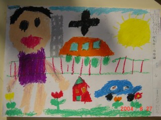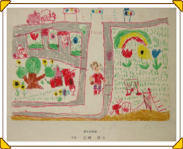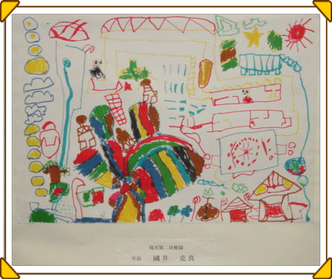 マジックのように色があると、その活動はもっと楽しくなり、いろいろ自分の想いがふくらむようです。描きたいものを思うように描くこと、描けることはとてもすばらしいことなのです。花のおうちが八本のマジックで一層鮮やかになりました。(講評)