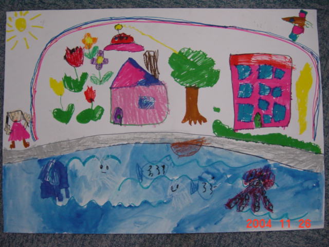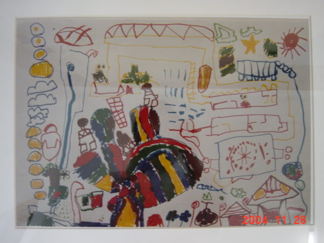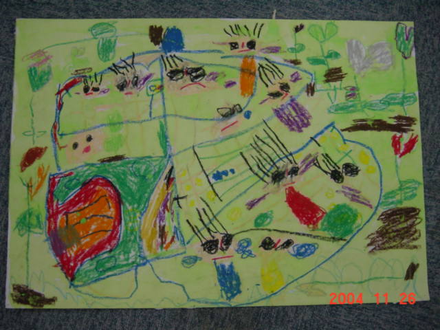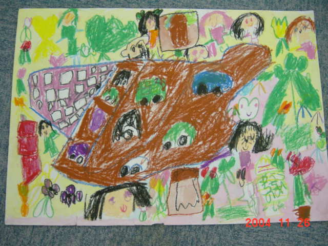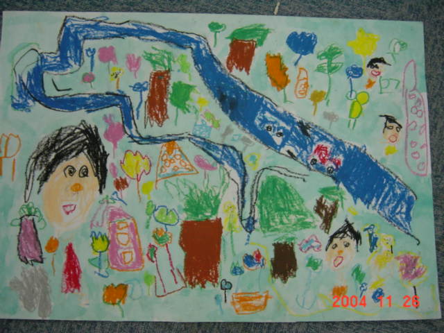 マジックのように色があると、その活動はもっと楽しくなり、いろいろ自分の想いがふくらむようです。描きたいものを思うように描くこと、描けることはとてもすばらしいことなのです。花のおうちが八本のマジックで一層鮮やかになりました。