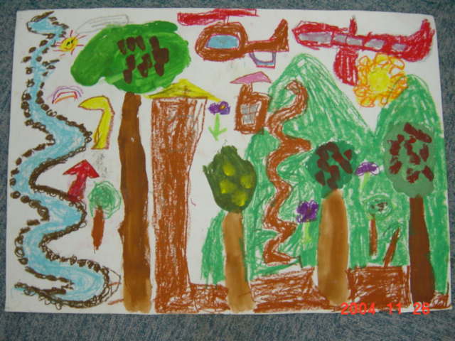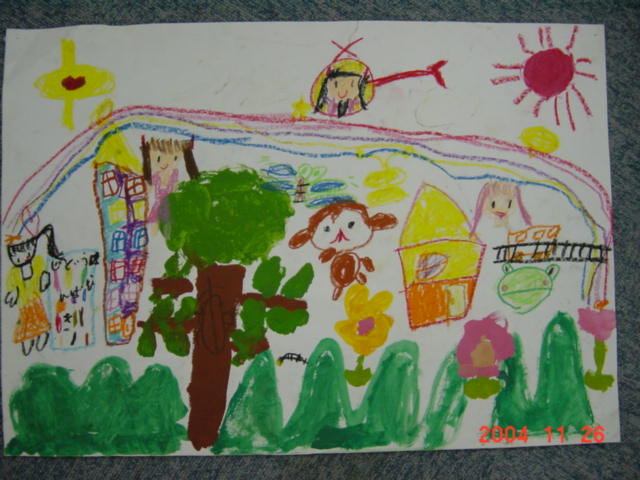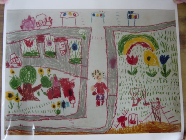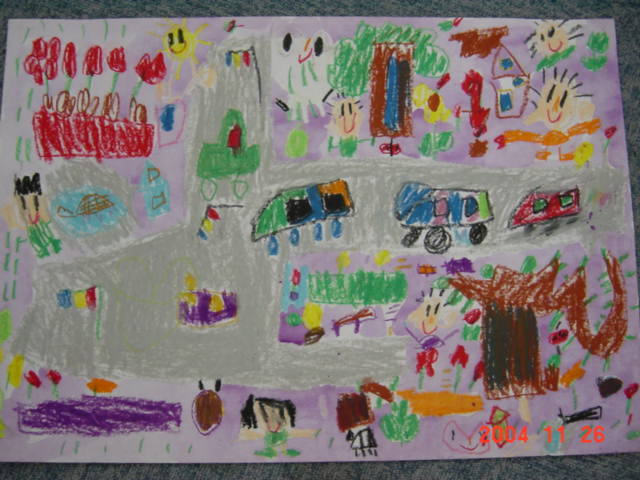 自転車も走っていて信号が光っている様子も描いているのは、毎日の生活でたくさんのけいけんをつんでいることがわかり、楽しい絵になっています。クレパスをつかって、美しく力づよく表現できているところが、すばらしいです。