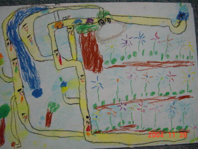 みんながみちあるいてて、みんながきたらおはなとりにいくねん。
