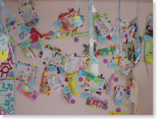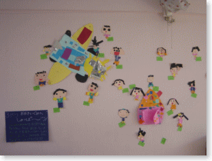 大きなひこうき、ロケット、空飛ぶおうちに画用紙で作った自分を乗せて年長さんへ出発です。