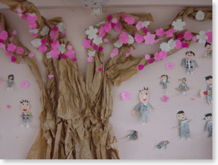 1月に作った桜の木にやっと桜が咲きました。折り紙を折って桜の花びらの形に切りました。