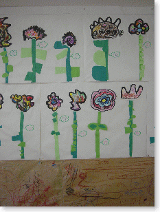 画用紙にお花紙を貼り、お花を作り、お花の真ん中に画用紙で作った自分を貼りました。