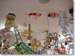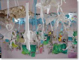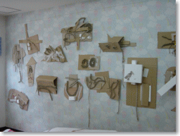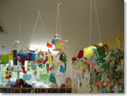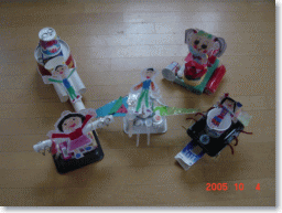 ダンボールや透明のカップ等で乗り物をつくりました。