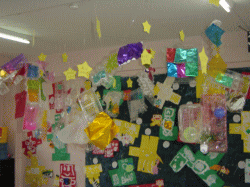 金色や銀色の厚紙をホッチキスでとめて形を作りました。