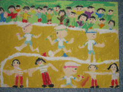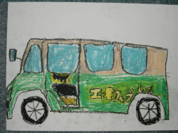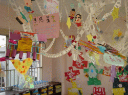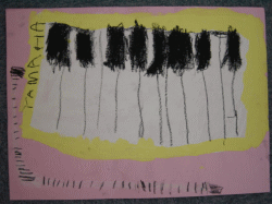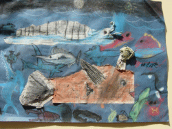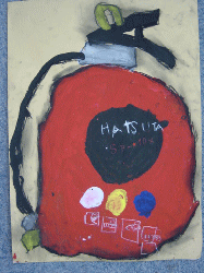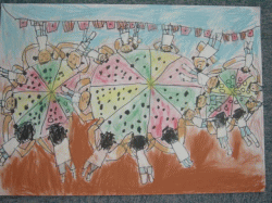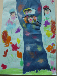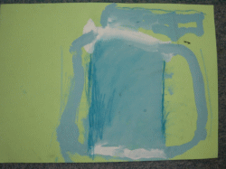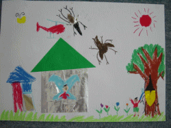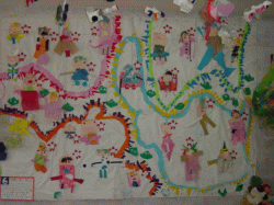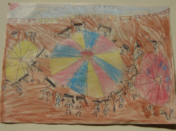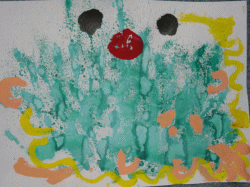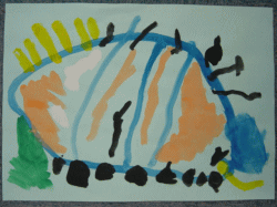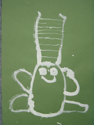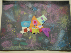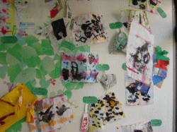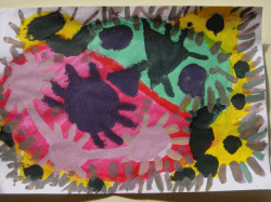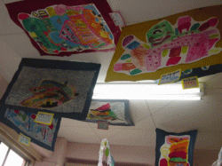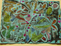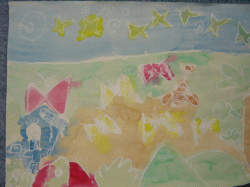 半紙染めに挑戦して虹の道に好きな物を描きました。