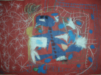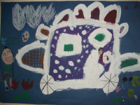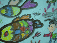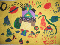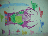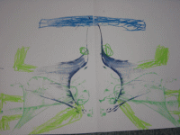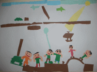 ブラックホールがあって、風で宇宙人が吸い込まれそう。地球があって、宇宙人が太陽に向かって浮かんでたから汗かいて地球に落ちた。太陽に、土星が合体した。水と草の星もある。宇宙人がお花を出した。もう1つの宇宙人がうんちみたいな生き物だした。