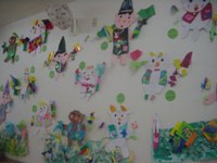 | 画用紙で作った自分達を乗せる乗り物を グループ毎に作りました。 |