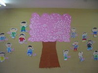 | 大きな木に桜の花が満開です。 画用紙で桜の花を作って貼りました。 |