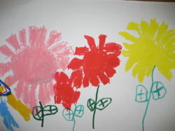 ぼくがピンクとあかと黄色のお花を見てる