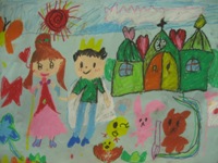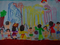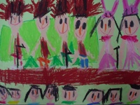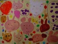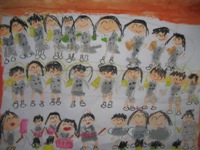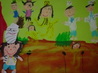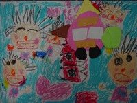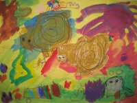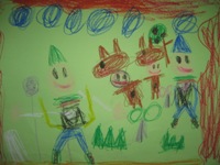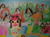 私と動物たちが、鬼ごっこして、おなかがすいたから、ライオンさんのレストランでおやついっぱい買って、ピクニックして食べてるところ。