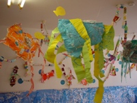 海の中でたこさんがすべり台して遊んでるの。