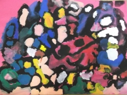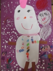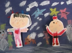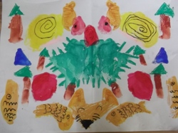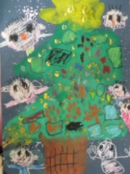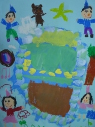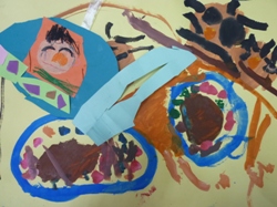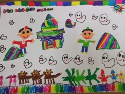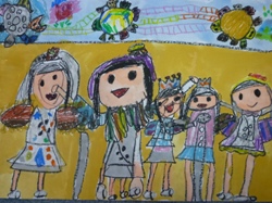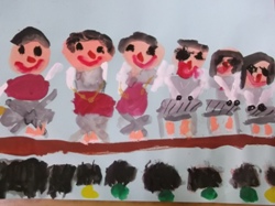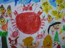 私と猿、かに、栗、はち、うす、みんなで柿とって食べる。
