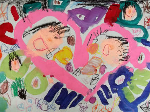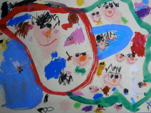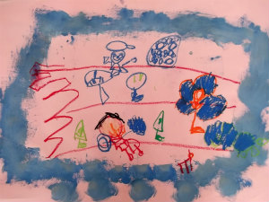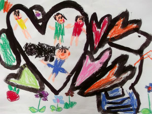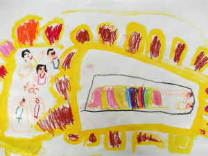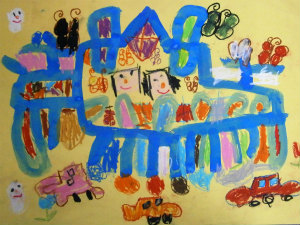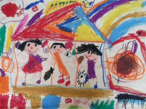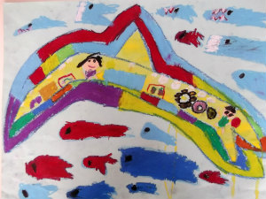 パパとママと僕がいる。家から水がでて虹が見える。家の中に魚たちも住んでる。