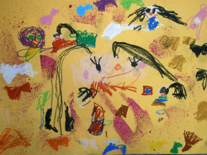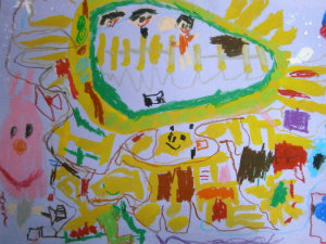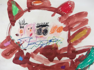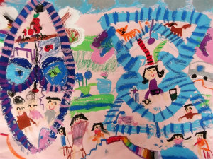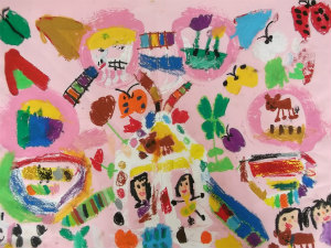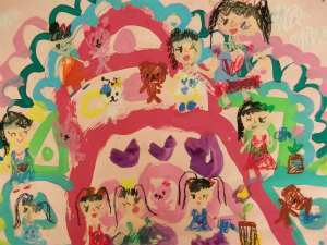 パパとママと私と弟とテントウ虫とバッタとオムライスを食べている。虹のすべり台もあって、ママはメロンのアメちゃんを食べている。