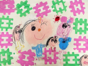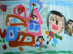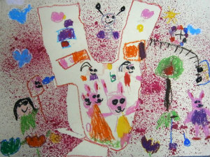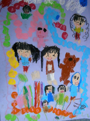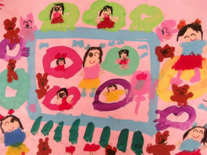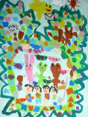 うさぎとくまと私とお姉ちゃんとお母さんが仲良く遊んでいる。みんなが楽しくなれるお家。