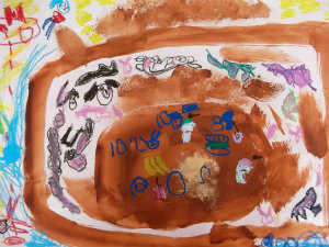 お家の中に宝物があって、みんなで宝探しをしてる。水の中で浮かんでるお家。
