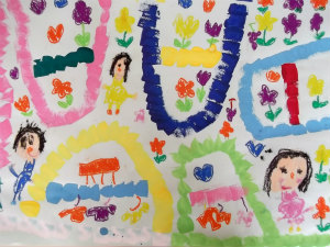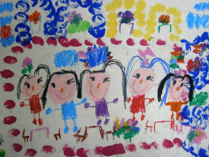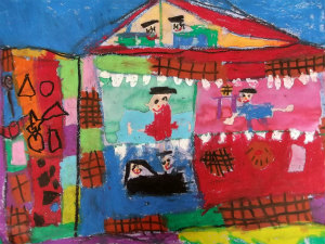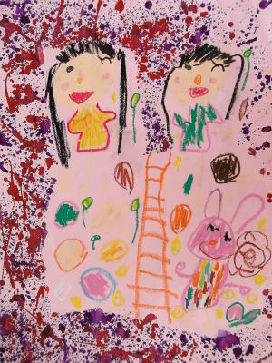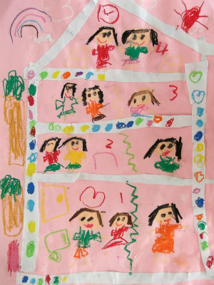 4階建てのお家。1階でえまとお姉ちゃんが遊んでる。お友達もきて遊んでる。