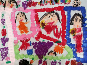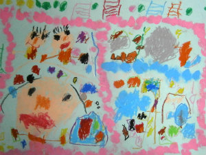 僕とお父さんとお母さんとじいじが、壁についてるアメちゃんを食べている。トンボといろんな色のバッタを捕まえお家で遊ぶところ。
