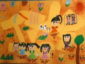 お友達と仲良く住んでいる。おもちゃがいっぱいある。ロボットのお家は空を飛べるよ。