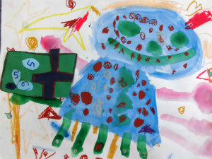 きいろいところがくるくるまわって海に潜っていく潜水艦で海を泳いでいたら、緑のところをぐにゃぐにゃ動かして泳いでる魚をみつけた。海は暗いから頭に電気をつけて泳いでる。