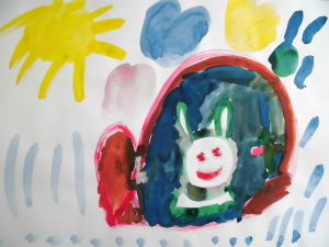 雨が降ってるから、うさぎさんがお家で遊んでる