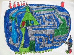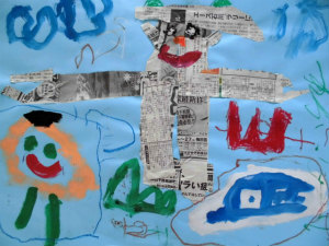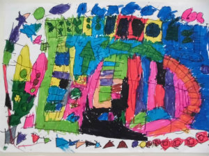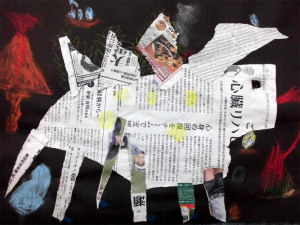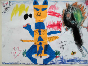 ロボットが遊んでいて鬼につかまっている。新幹線が火の中を走っている。