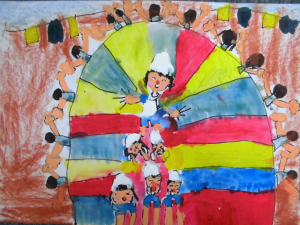 『みんなでパラバルーンしてる。なかよくみんなで楽しんでる。』