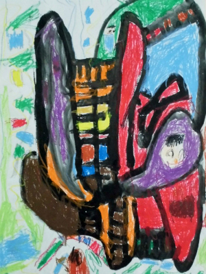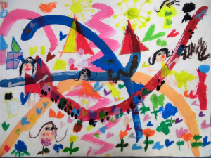努力賞とりがうたっていて汽車がはしっている。お母さんと私とお友達とピクニックに行くところ。虹につながらはしごがあって、みんな笑ってる。