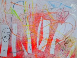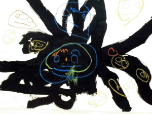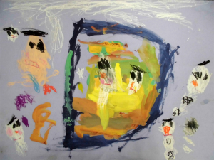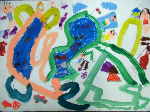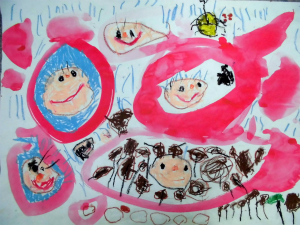 佳作ピラミッドを見ながら絵を描いてる。パパが海で釣りをして、カッパがでてきてビックリしてる。