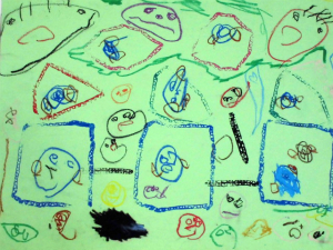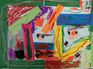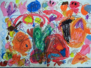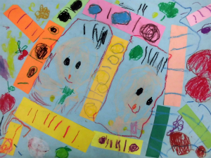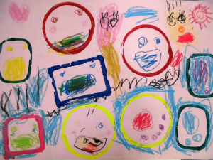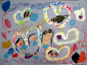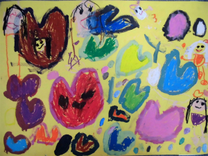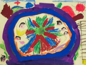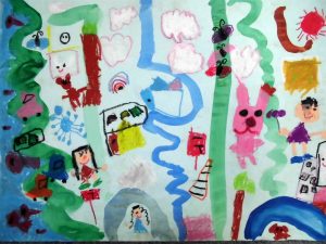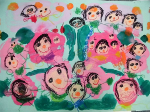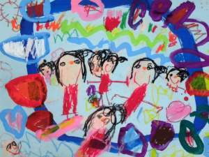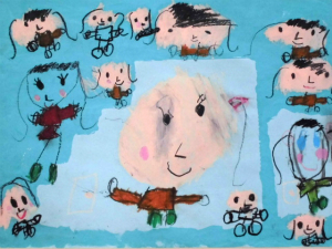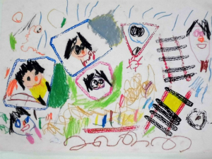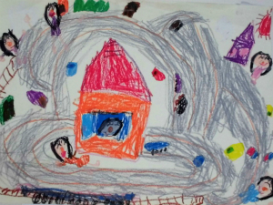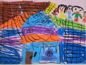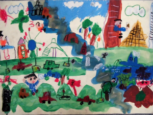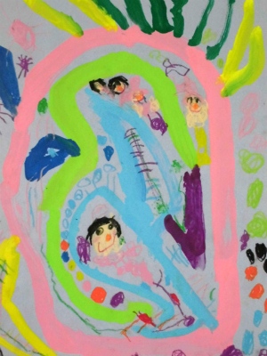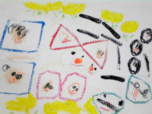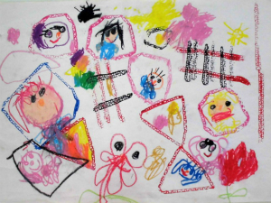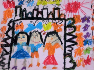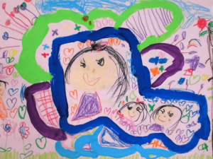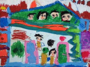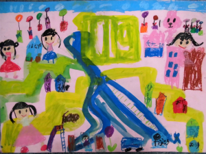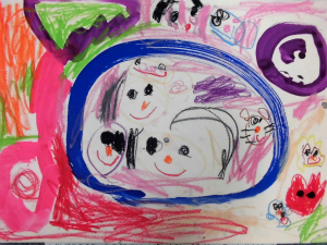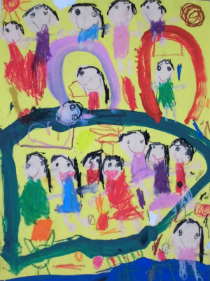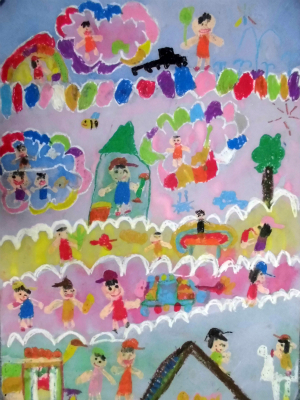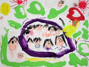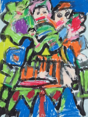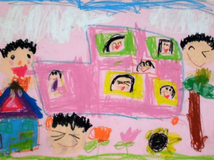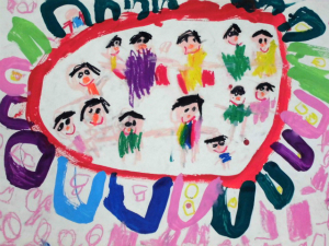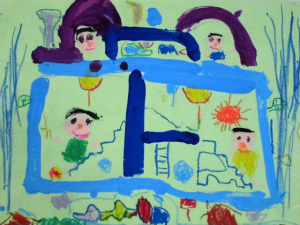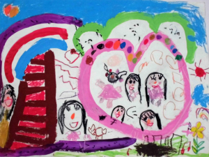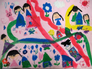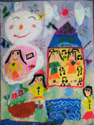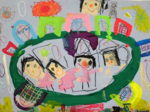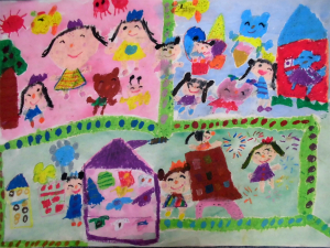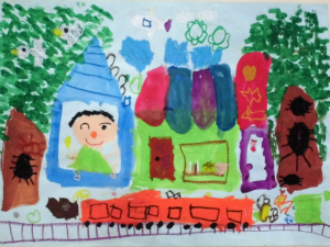 努力賞お母さんとお父さんと私がいてえ、みんながきて仲良くお絵描きして遊んだ。お仕事するところがあって外には公園がある。
