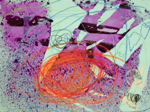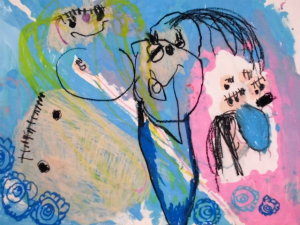 努力賞エルサと先生と私がリボンの街で一緒に踊ってる。リボンの形をした遊具が遊園地にある。