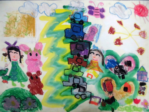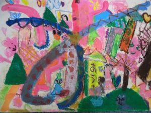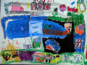 努力賞黄色の電車が街を通ってて、ママと私とおじいちゃん・おばあちゃんが住んでる。電車に乗ったらピクニックにいける。