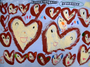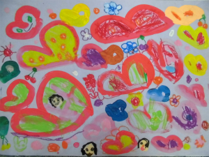 努力賞お友達がお花を見ながらハートごっこをして遊んでる。お外でお祭りをしていてヨーヨーと虹がある。