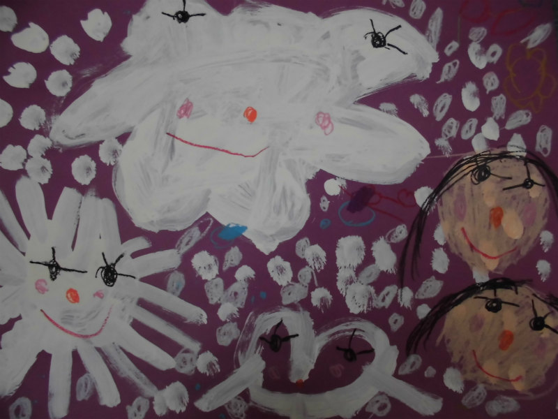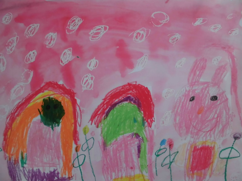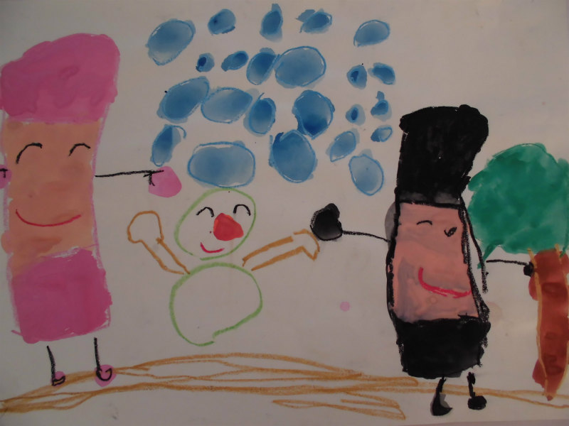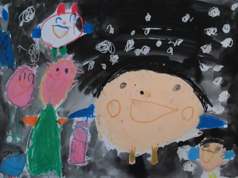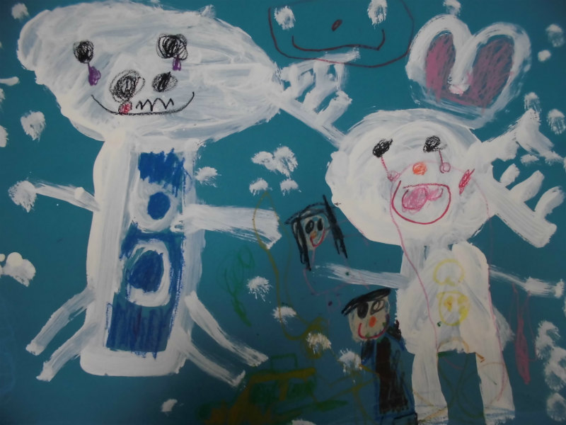 『お花のゆきゆきかいじゅうとママと私が雪だるま作ってる。』