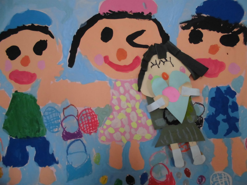 『ねこさんのてぶくろ』ままとぱぱと私と私の友達みんなでしゃぼんだまをしている。