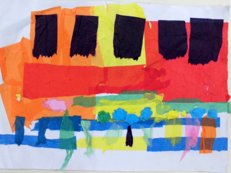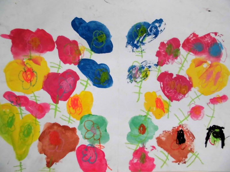 『ママとおともだちがいて、パンダをみてる。ボールとやまとチュウリップと木とトラックとおひさまがある。バイキンマンがあそんでる。』