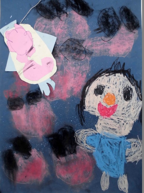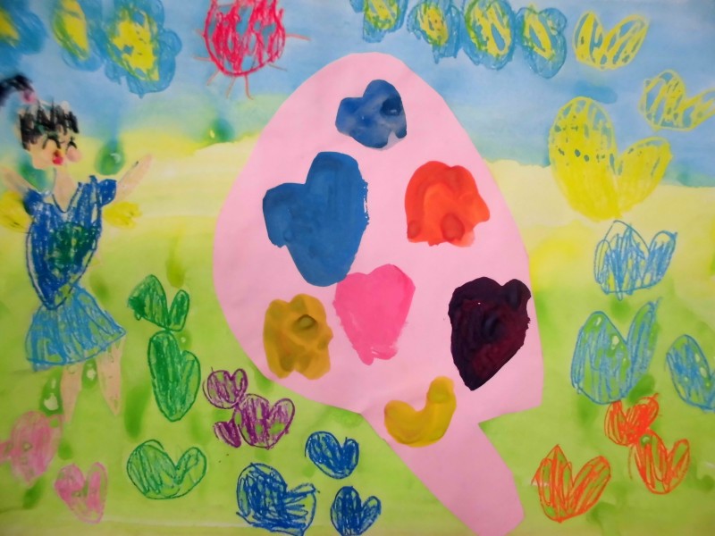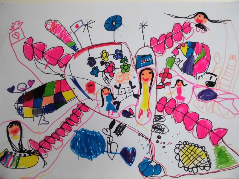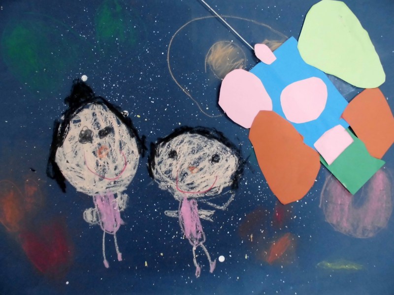 『お花とハートのロケットに乗ってちょうちょの宇宙人とお話している。』