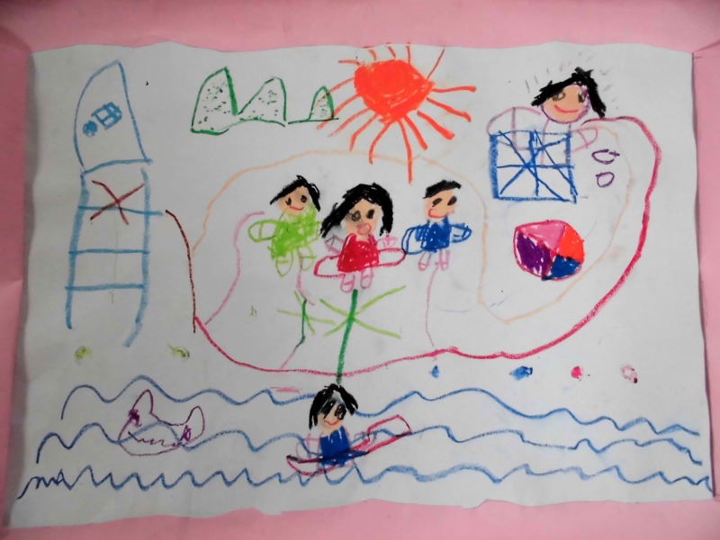 『みんなで海で遊んでる。船にのって綱引きをしたり、ボール遊びをしてる。太陽も一緒に遊んでる。』