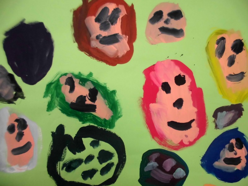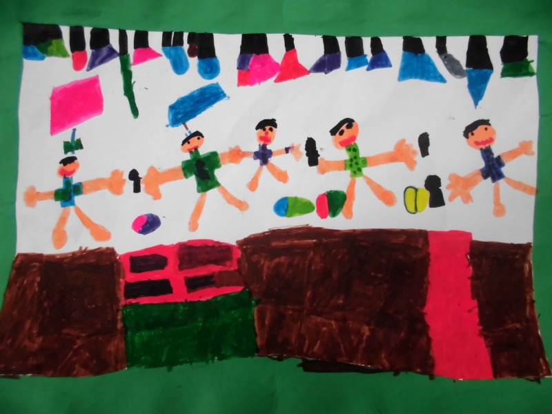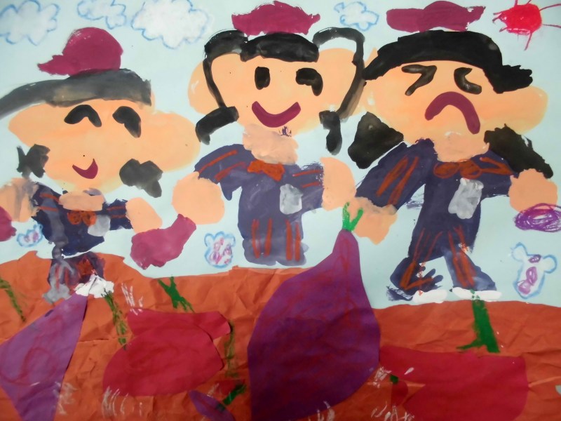 『お友達とお芋を掘って、掘れたから「やったー!」って、上にあげてる。』