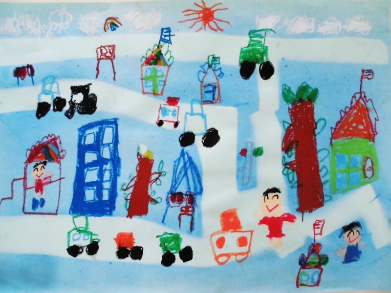 『車がいっぱい走ってる街』車で仕事に行ったり、お買い物に行ったりしてて、僕は家ででかける準備してる。