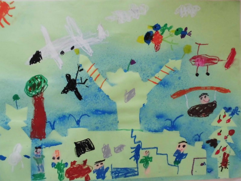 『鳥がいっぱい住んでる楽しい街』鳥たちが空を散歩してて、パラシュートしたり、お家の中で遊んだりしてる。