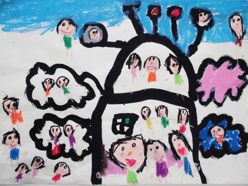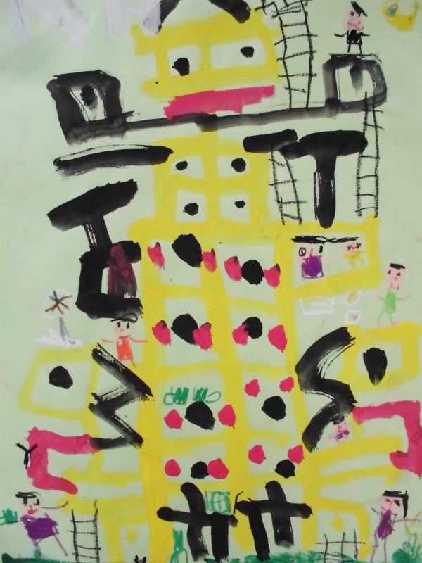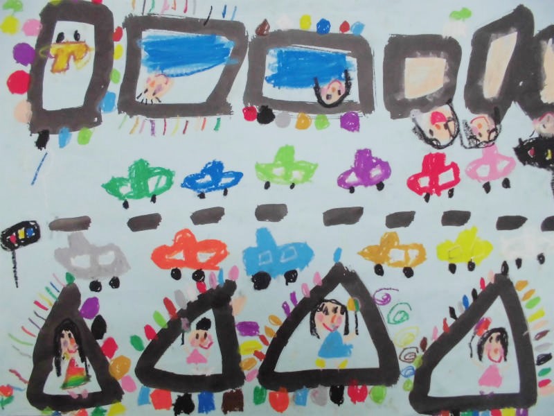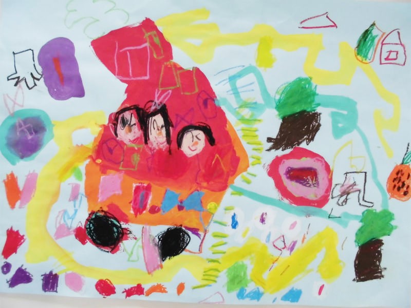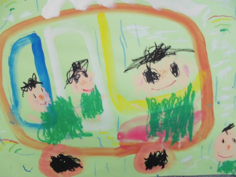 『車の走るおうち』まちの中を走ってるねん。途中、みかんの木があってよろこんでるよ。