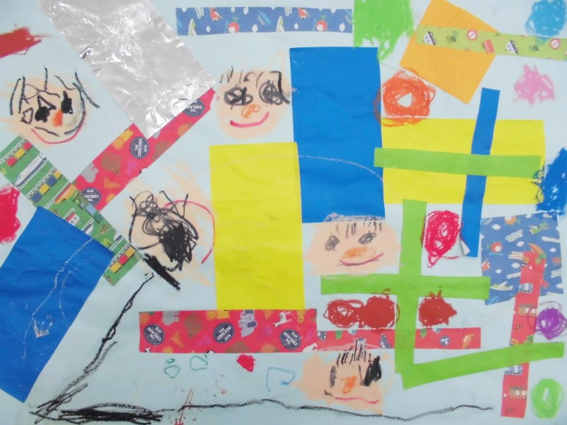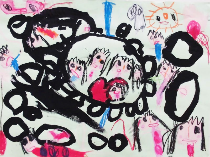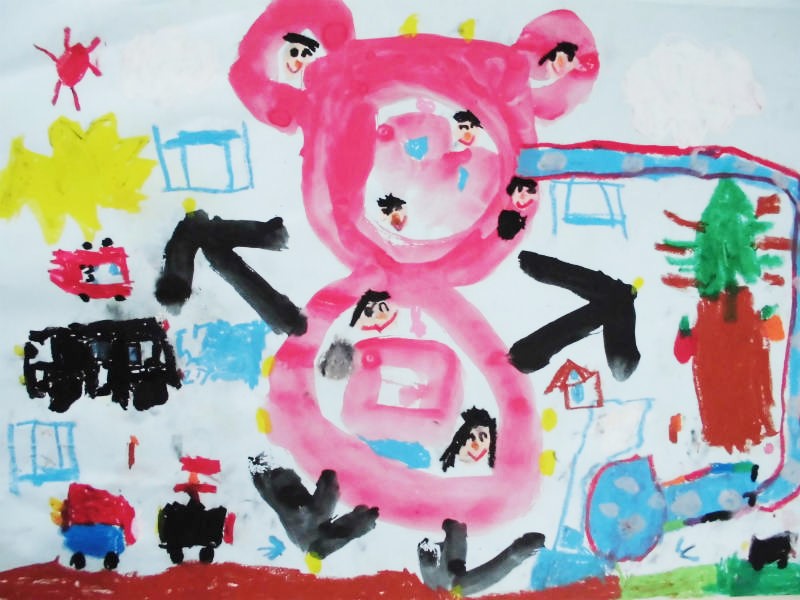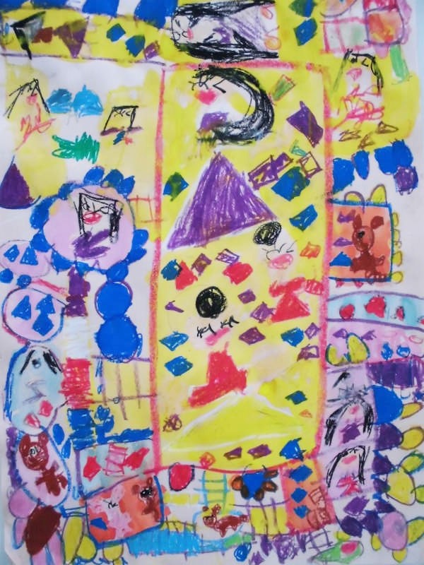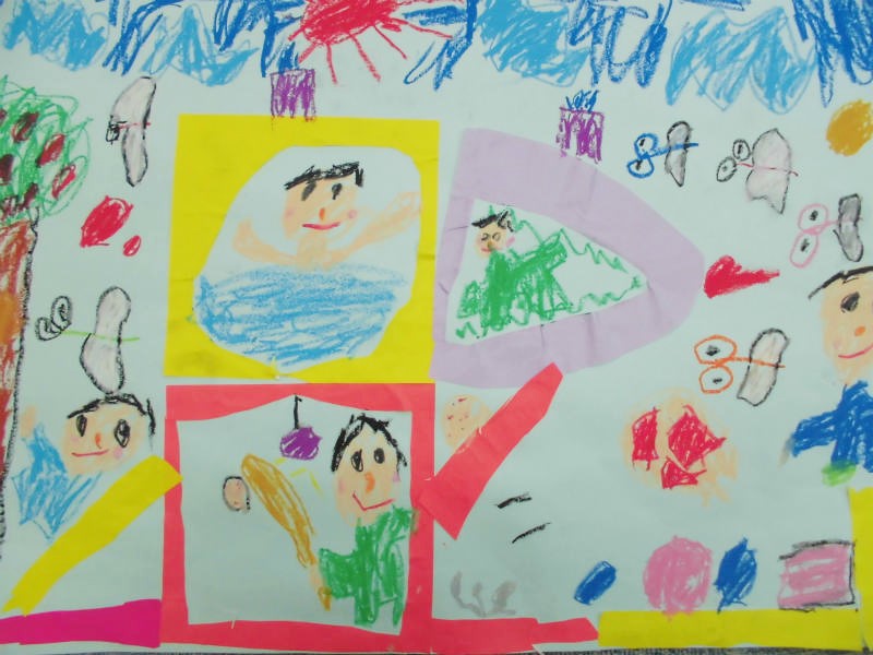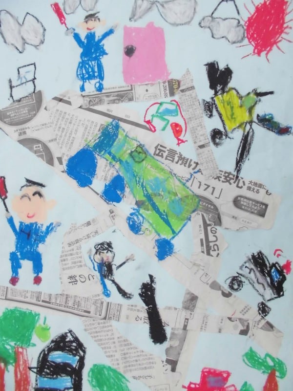 『どうぶつの街』お友達と僕が、ぞうさんとウサギとライオンとキリンと遊んでいる。僕がお化けと戦っている。