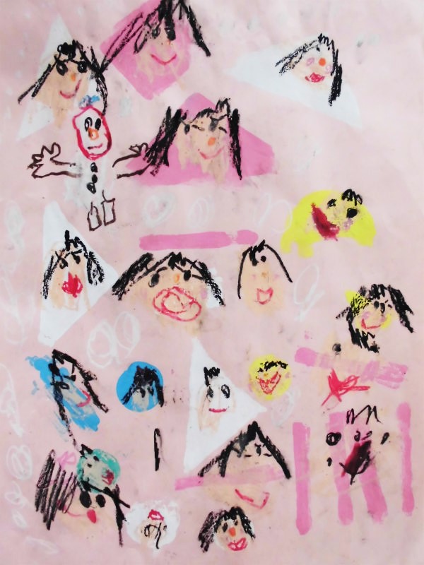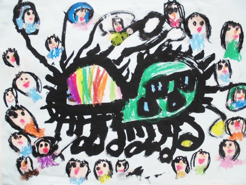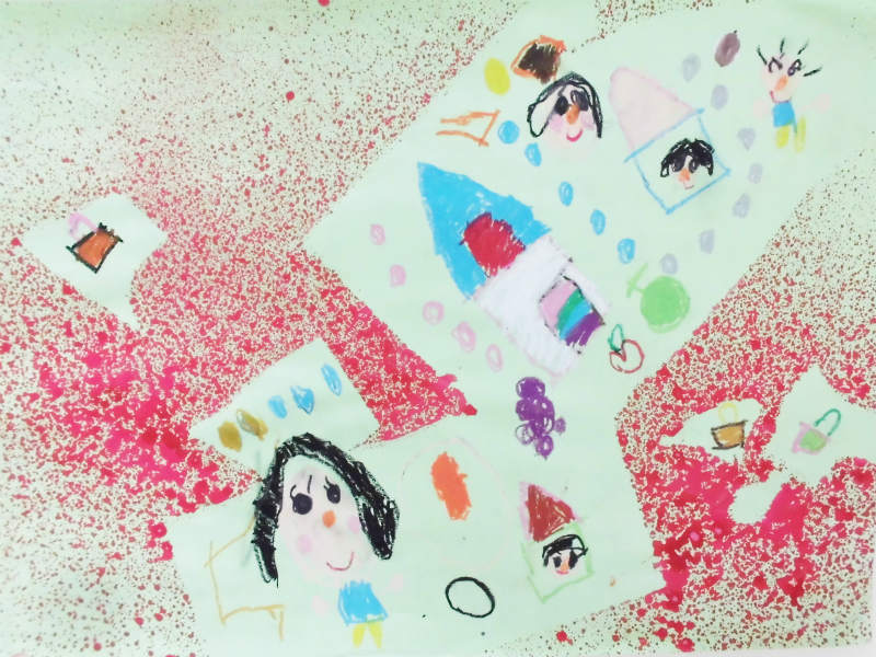 『うさぎとてんとう虫とおばけの街』私が鏡を見ていたら、おばけが泣いているのが見えて、お花あげたら、優しくなった。うさぎとてんとう虫が遊びに来て、果物を食べた。うさぎとてんとう虫のお母さんは買い物をしている。