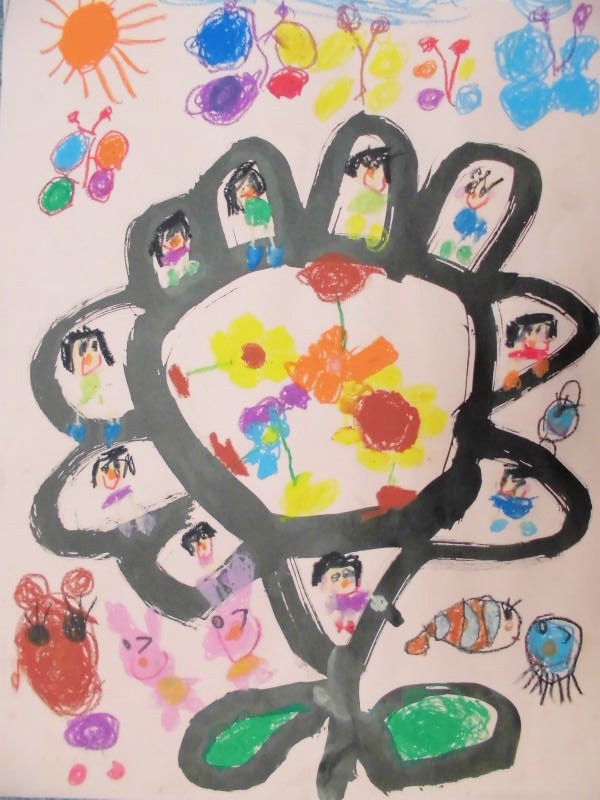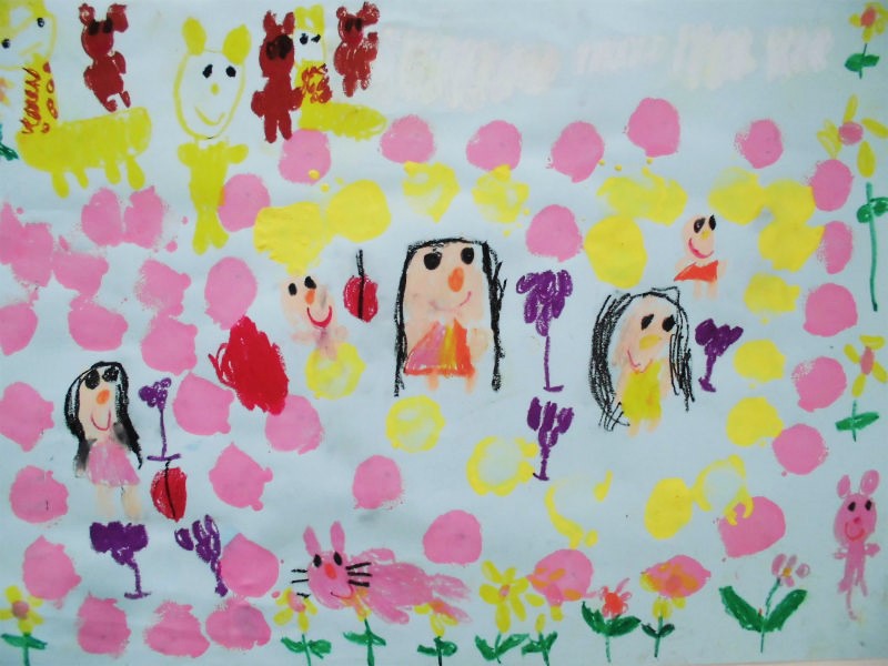 『お花のおうち』私とみんながお花のおうちに遊びに行って、いいにおいのお花を集めて、白雪姫みたいになってる。