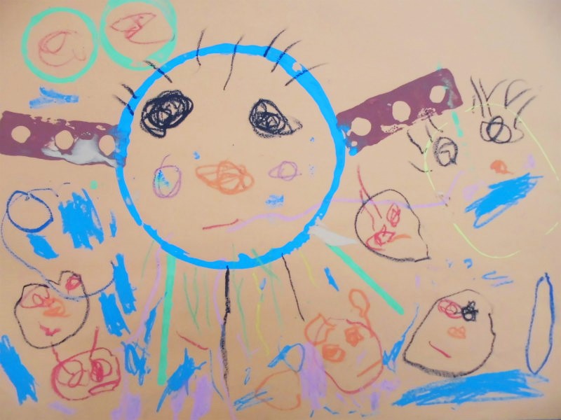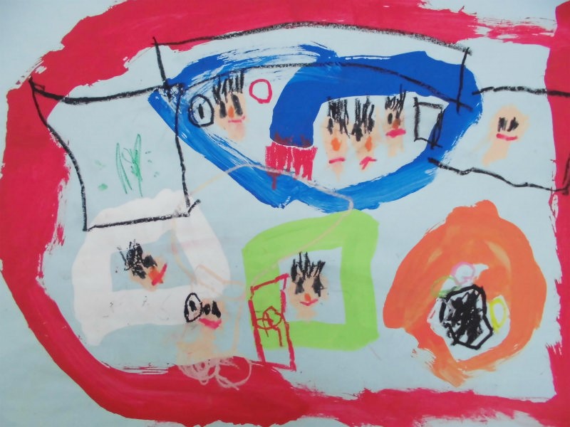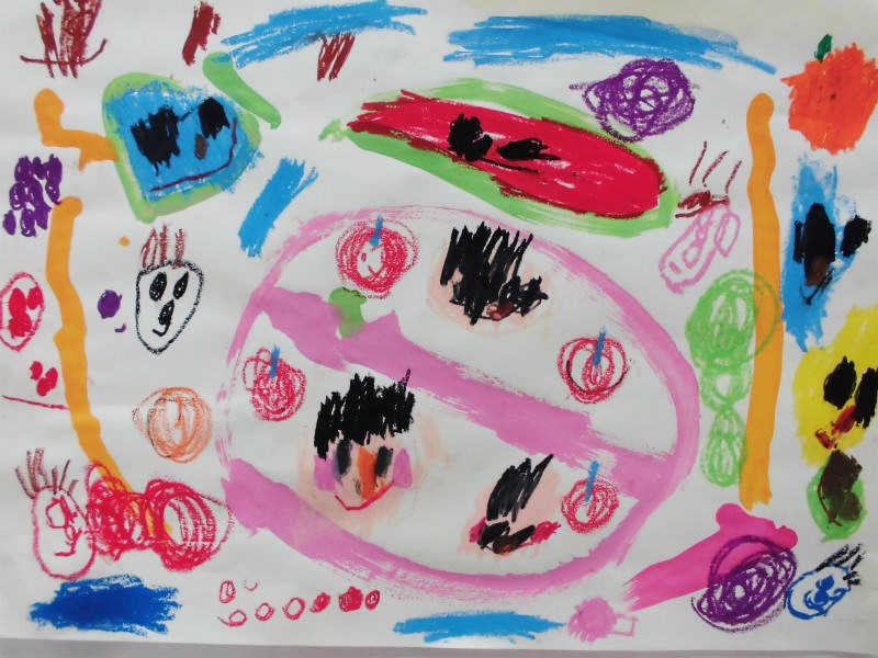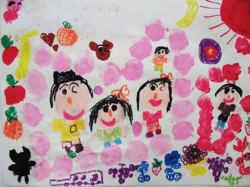 『フルーツのおうち』メロンの扇風機でお母さんが涼んでる。ねぇねは、クッキー食べてて、お父さんはメロンのバットで野球してる。僕はお花があるお部屋で、りんご食べてる。お外にバナナのお花が咲いてる。
