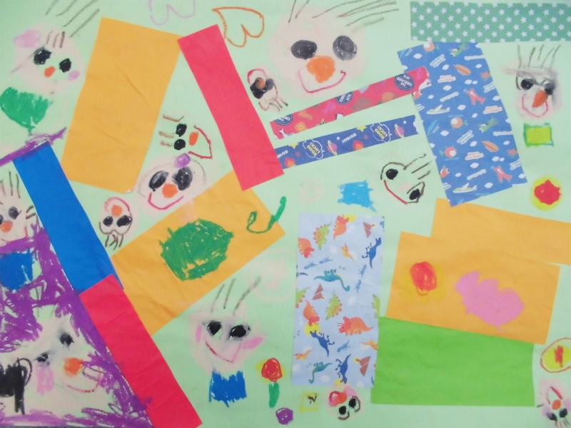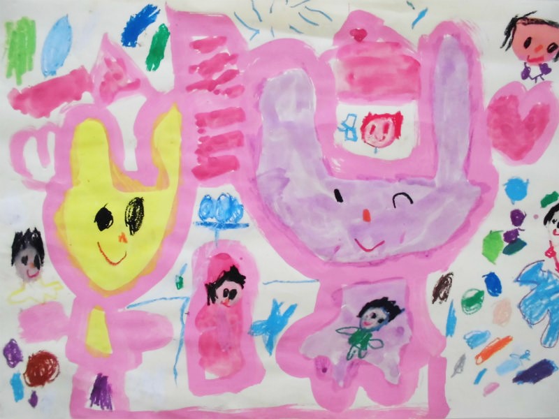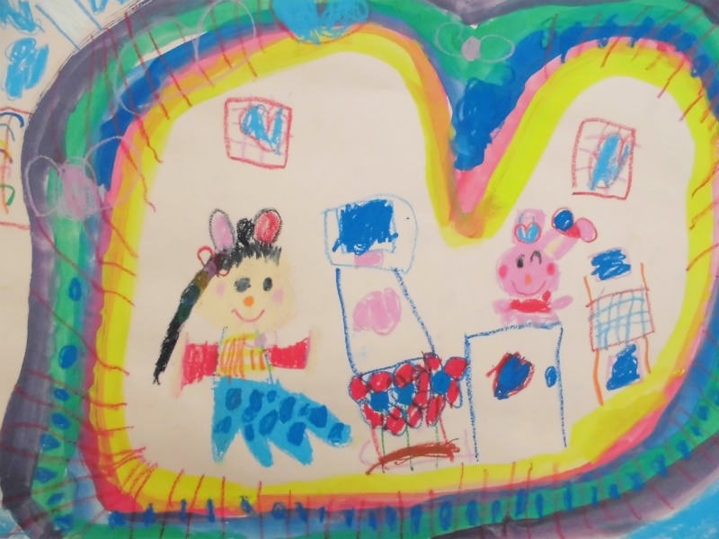 『幼稚園』幼稚園で雲探してる。うさぎはご飯食べてる。お化けが来て、怖いから電気つけてる。ハートのブランコもある。