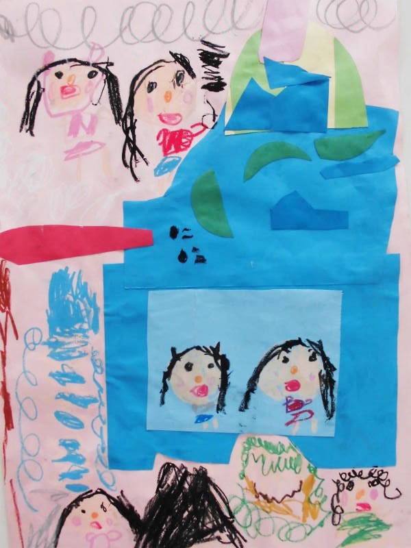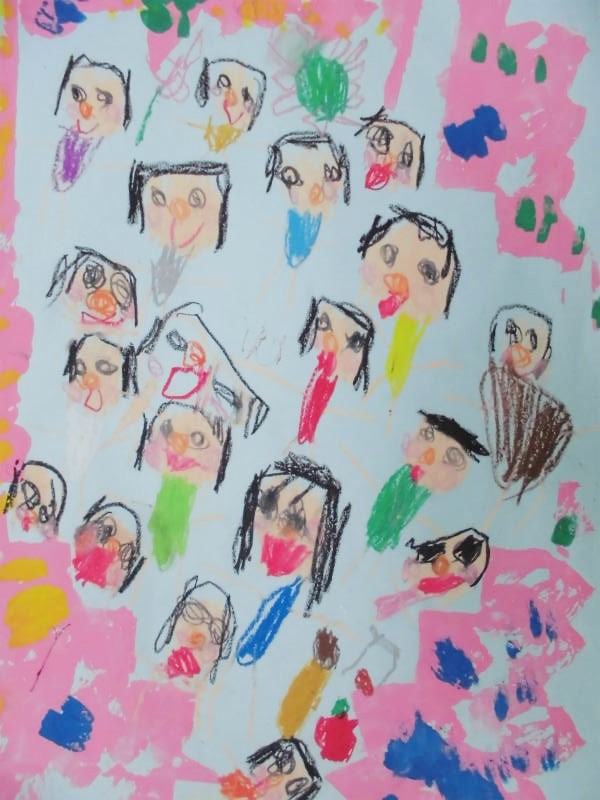 『風船がいっぱいある街』みんなで風船で遊んでいるところ。いろんな色のだんご虫がいて、だんご虫たちが6人組になってつながっている。すごく楽しい街。