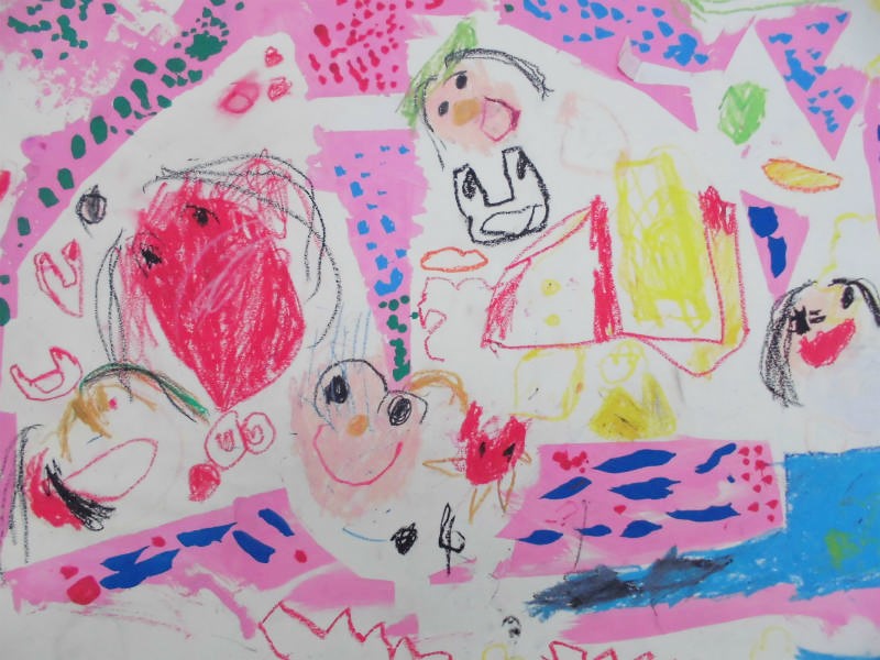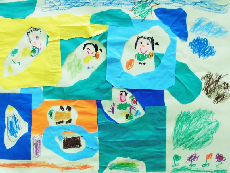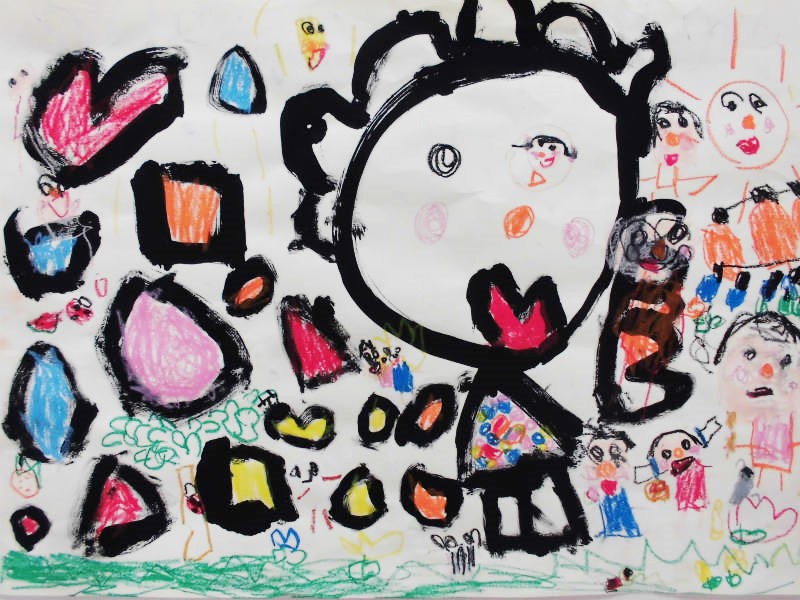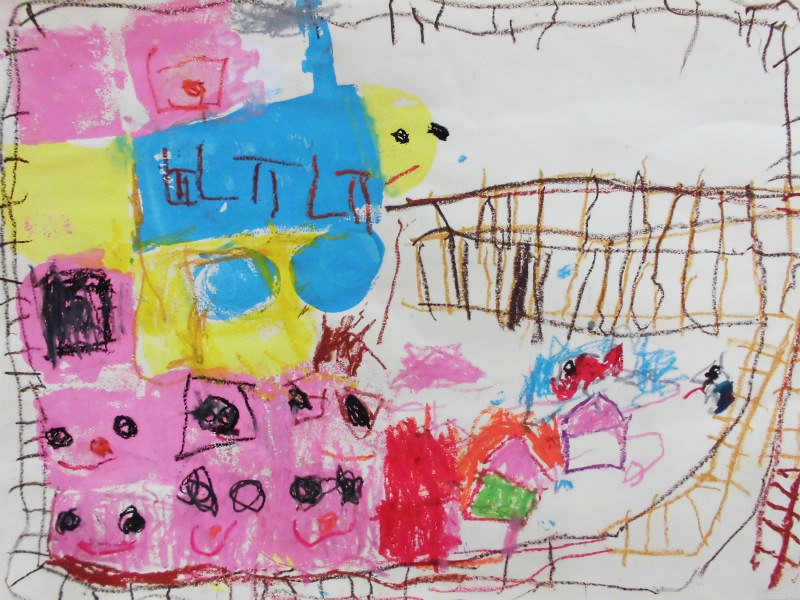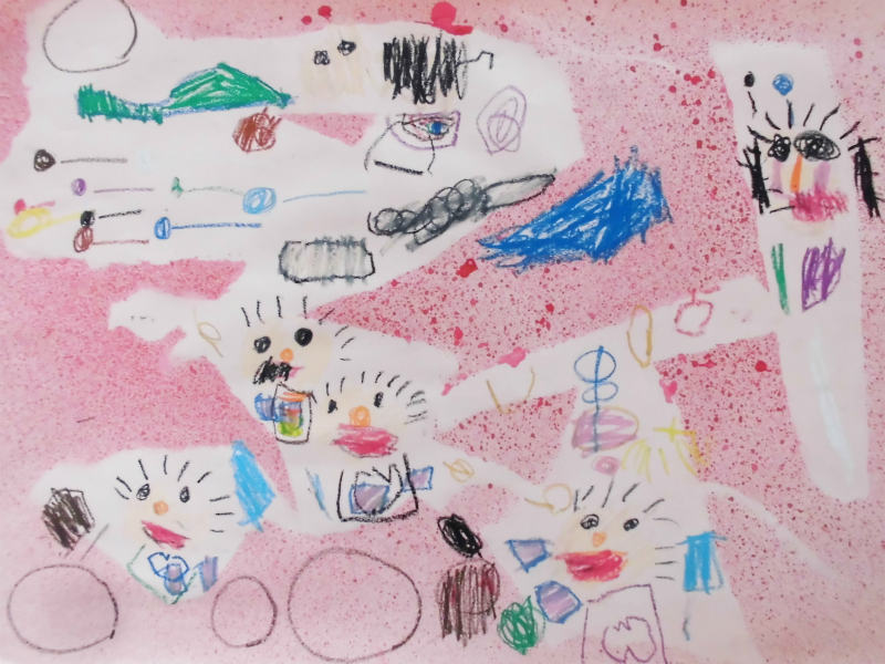 『食べ物のまち』チョコレートのお家にみんなが住んでる。すべり台と、焼き肉食べるところがある。氷のプールがあって、魚釣りしたり、鬼ごっこしたりして遊んでる。